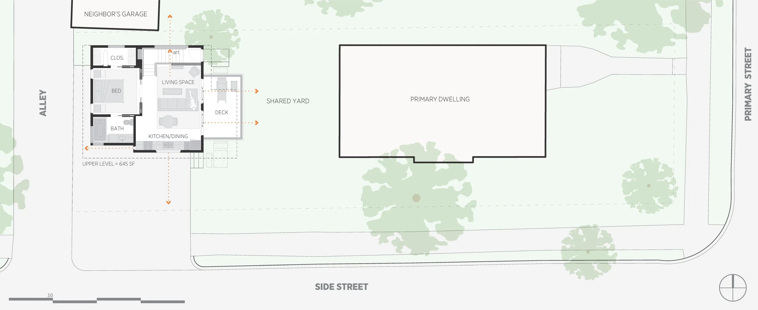 Side Street Suite is a contemporary 640-square-foot accessory dwelling unit (ADU) that sits perched among trees in South Minneapolis’ Longfellow neighborhood. The homeowner is an empty nester who no longer desired to inhabit a 2,700 square feet home. A unique solution was to build a one-bedroom ADU in the backyard of his rental duplex.