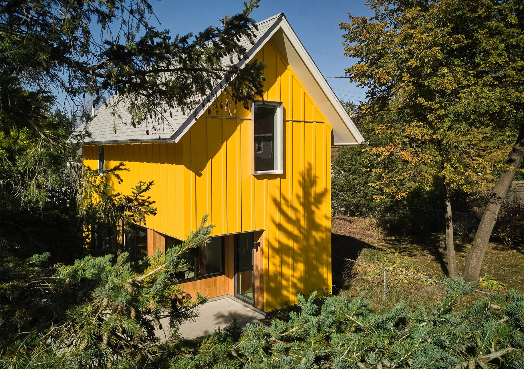 To create a sustainable project, we used Structurally Insulated Panels (SIPS) to construct the home. SIPS are a modular construction method. Instead of building the exterior walls in individual layers, the materials (studs, insulation, and sheathing) arrive sandwiched together in a panel. The panels are custom-made for each project, which allows them to “snap” together quickly on-site, much like a Lego set. Our client was interested in SIPs for their airtight, continuous insulation and reduced construction waste. The noise resistance provided by SIPs is an additional benefit because of the ADU's urban location. A post-construction blower-door test confirmed the air tightness and efficiency Sunflower.
